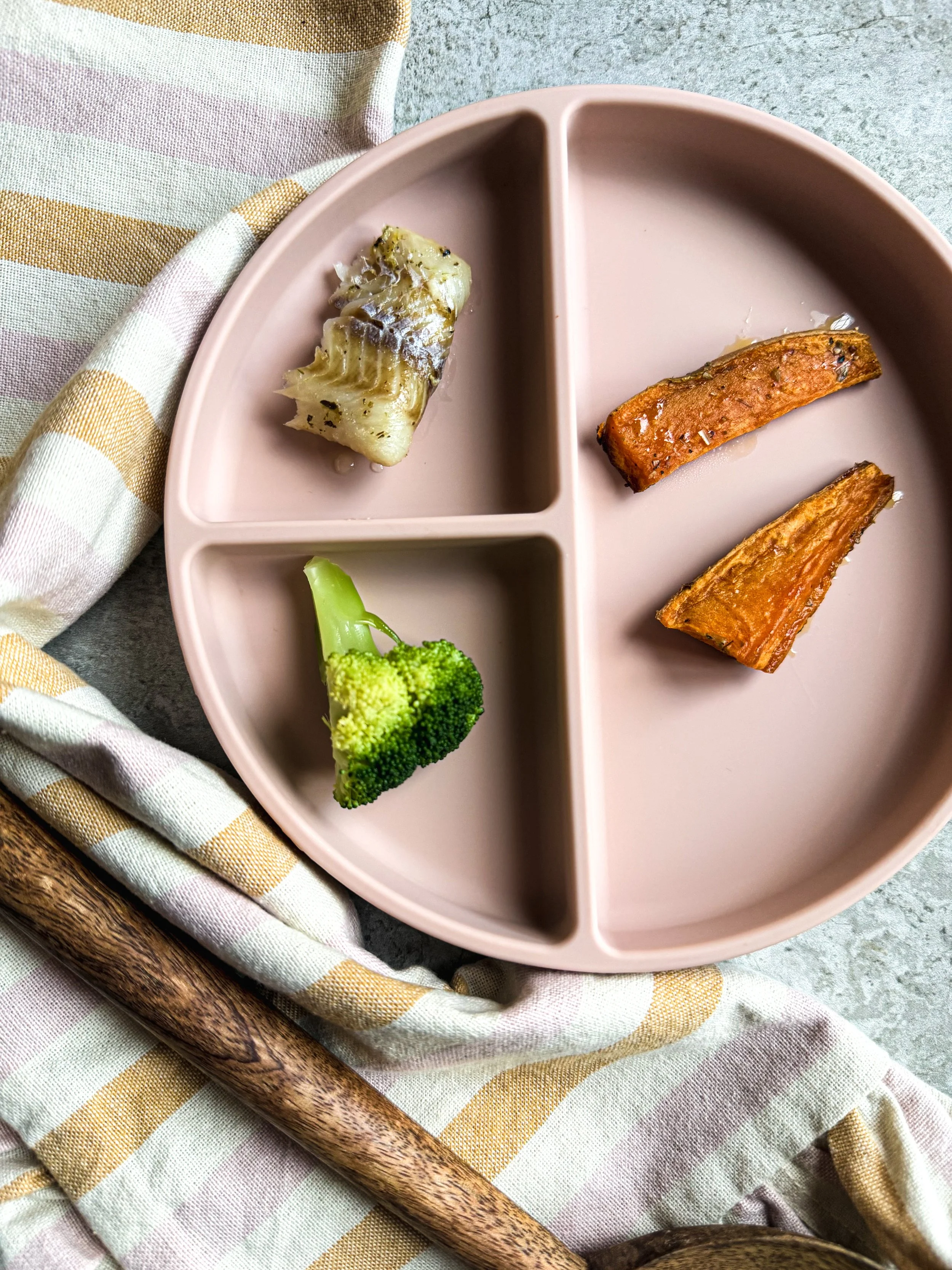 Cod is one of my favourite first foods for babies. Fish is nutrient dense and packed with protein, iron, and also iodine and omega-3 which both support healthy development. It’s soft and flaky when cooked and breaks apart easily in babies mouths making it a perfect first texture. I offered fish to my little girl loads when she was starting out with weaning. This recipe cooks the fish in garlic butter whilst wrapped up in a parcel to essentially steam + roast at the same time giving a softer and flakier texture. Butter gives a kick of energy to support babies high energy needs.
