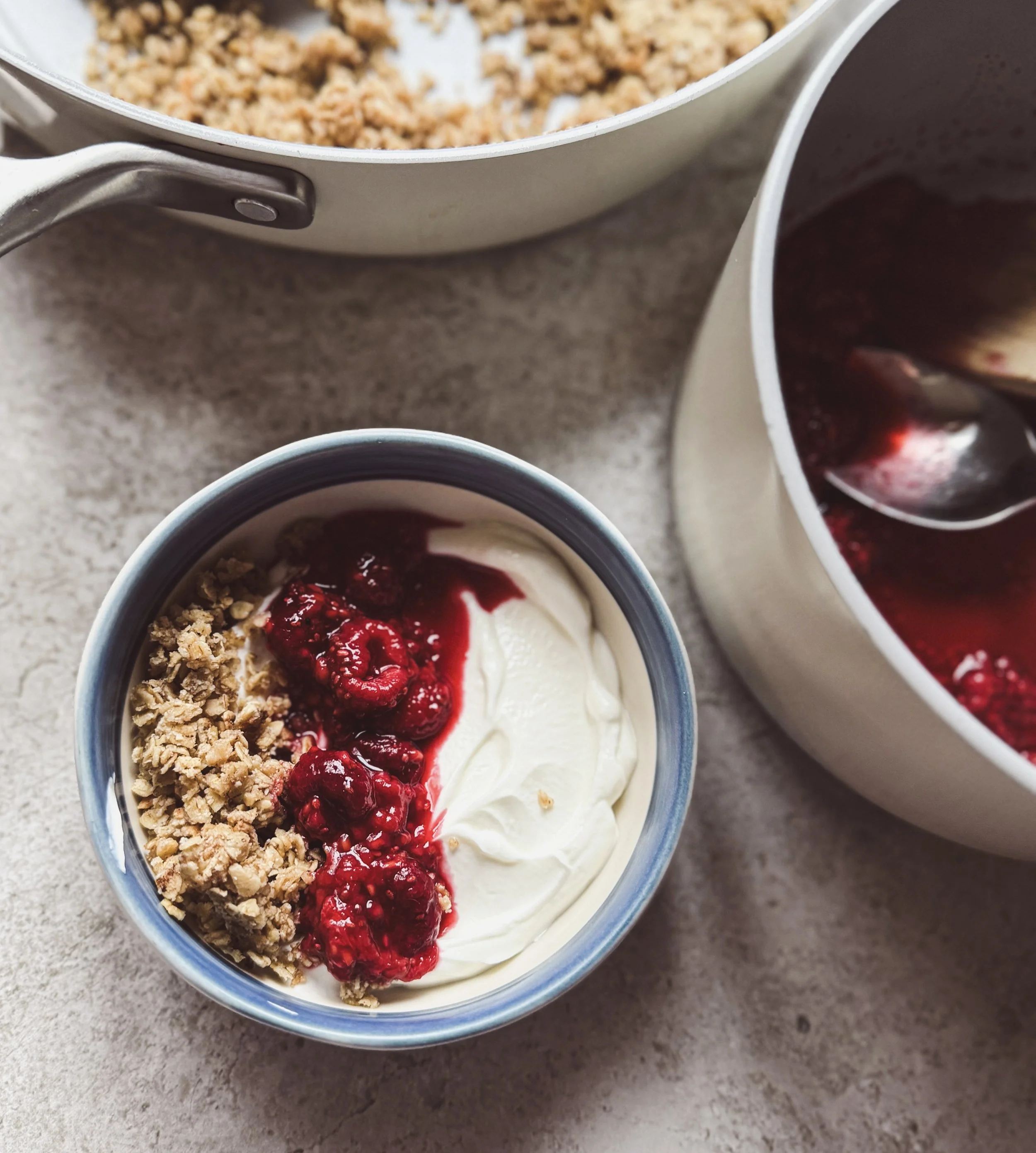 Spoon over the granola on top of the yoghurt and then spoon the raspberry chia jam alongside it