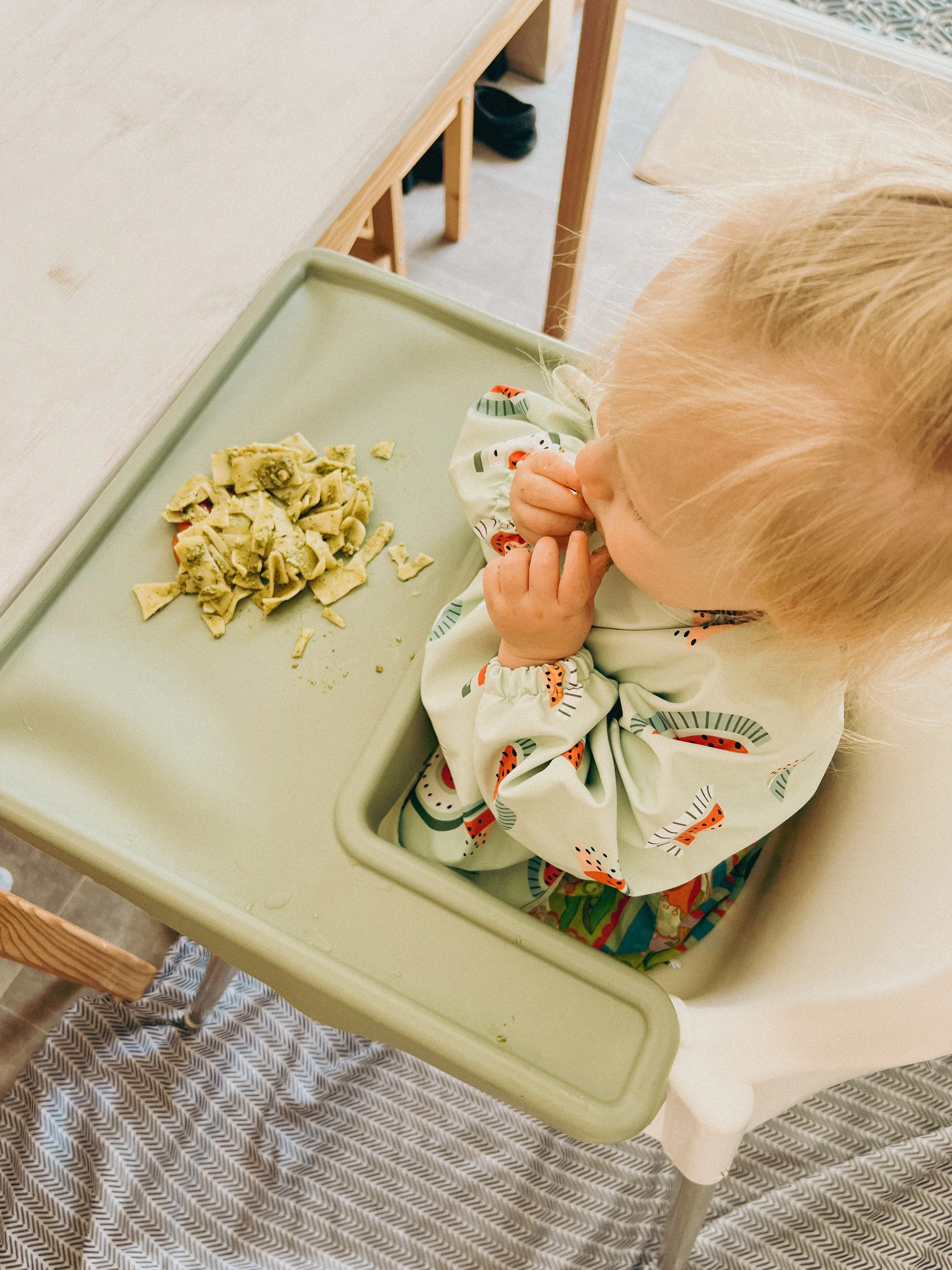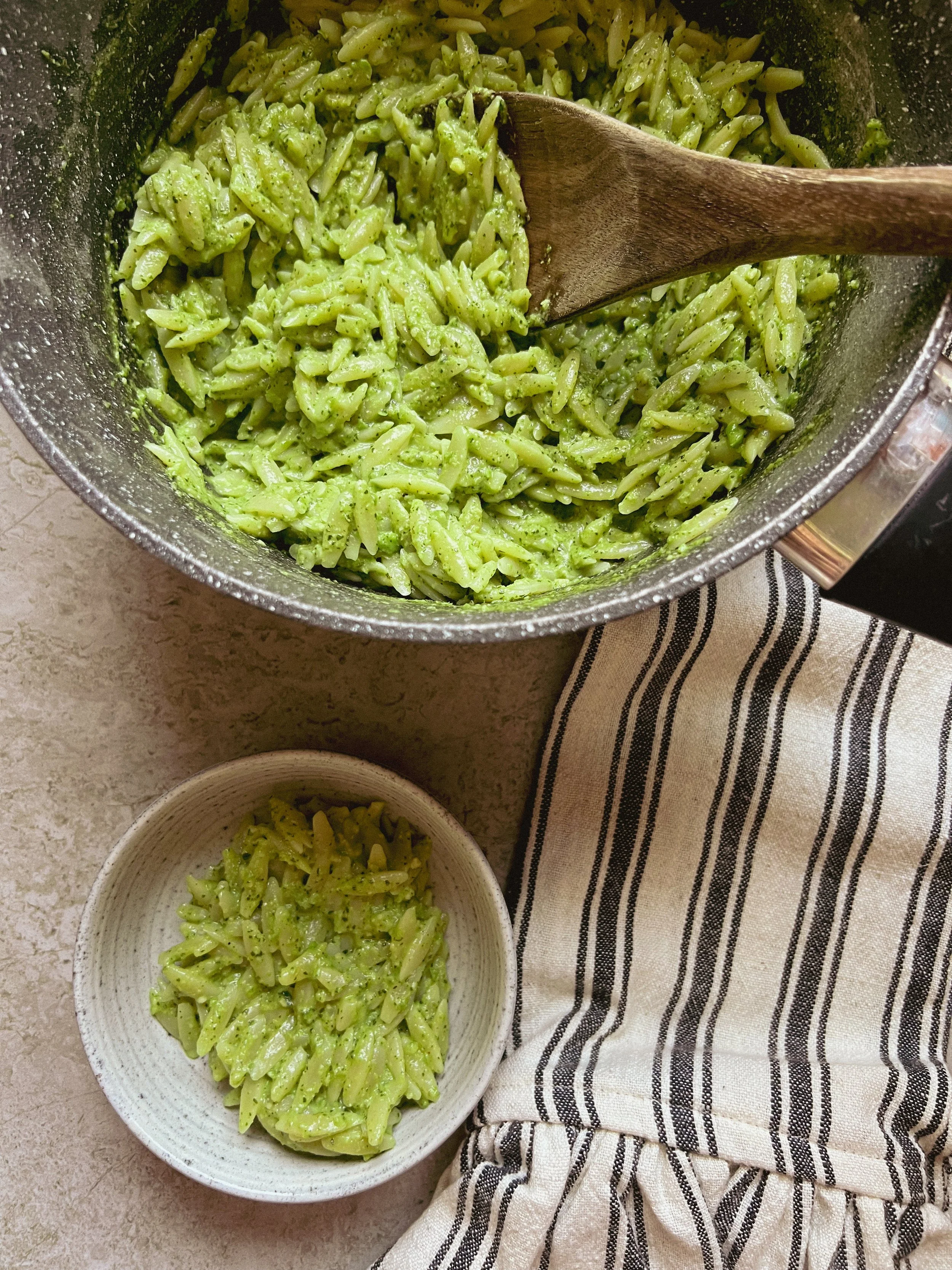 Try serving the pesto with larger pasta pieces like penne, rigatoni and fusilli instead of (or alongside) orzo and encouraging self-feeding for little ones 7 months and up!