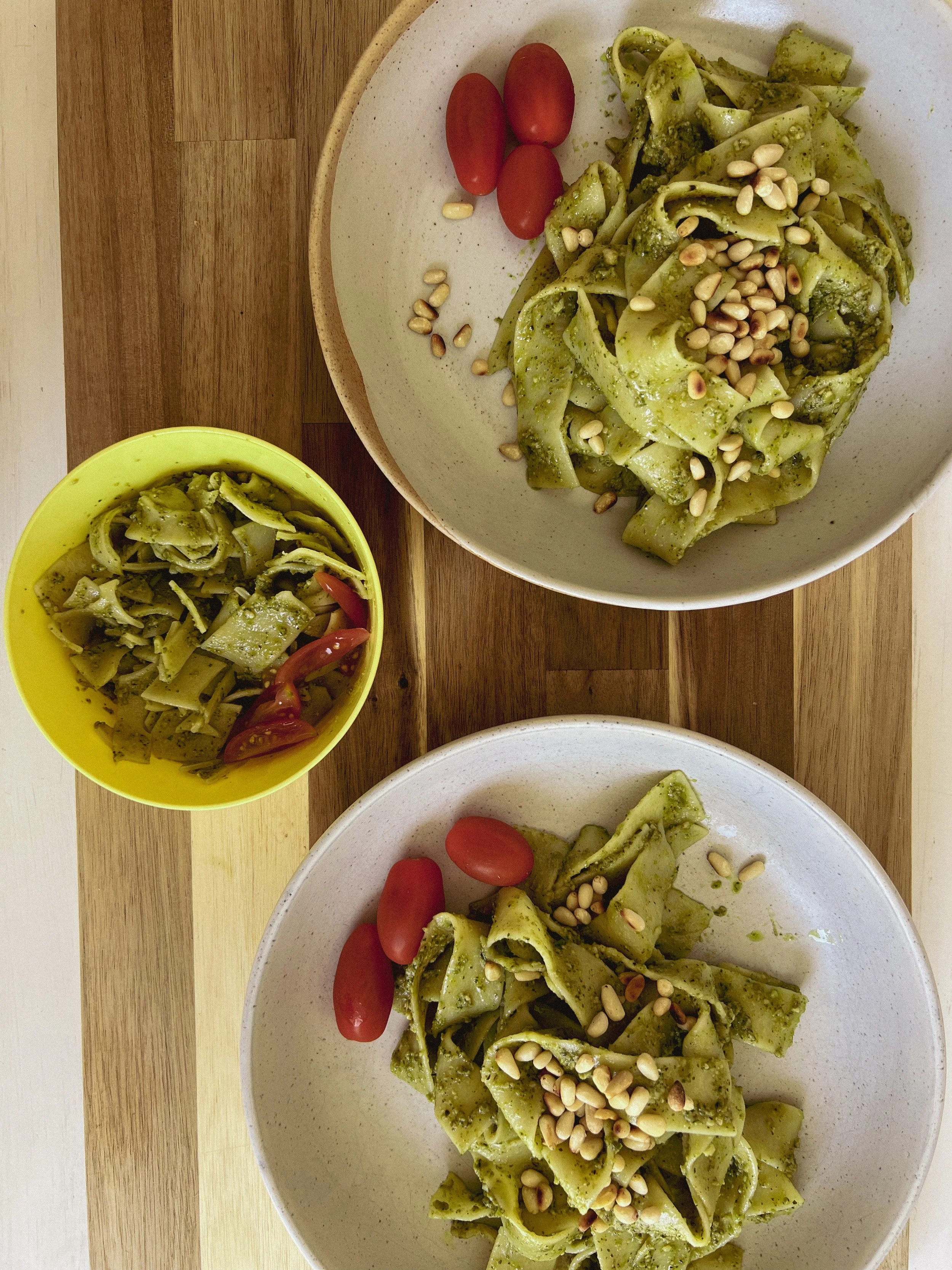 ~For adults. I’ve served the pea pesto stirred through some Pappardelle as a main dish topped with some toasted pine nuts for extra texture and protein and fresh plum cherry tomatoes